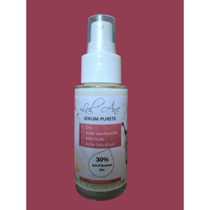 Sérum anti-acné concentré à 30 % de lait d’ânesse, enrichi en zinc, niacinamide, AHA de fruits, acide salicylique, acide hyaluronique, aloe vera et huile de nigelle.